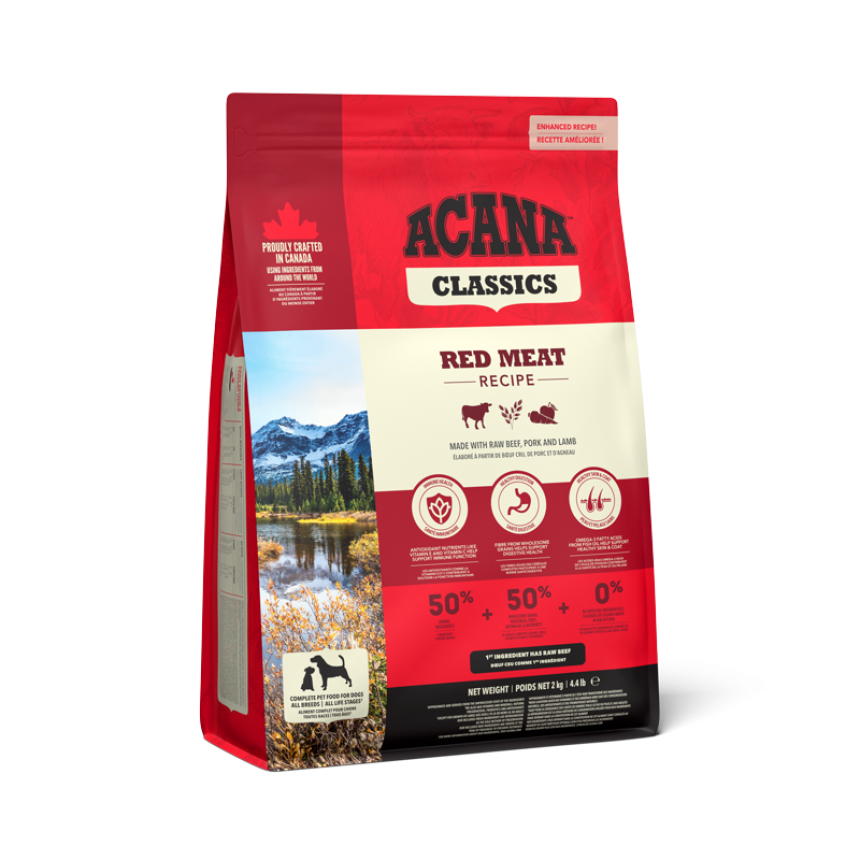 Рецептури ACANA ретельно готуються зі смачних та якісних інгредієнтів, від початку і до кінця. Баланс цієї рецептури розподілений у пропорції 50/50 між багатим вмістом м’ясних інгредієнтів та високопоживними фруктами та овочами та зерновими. Рецептура АКАНА Классікс Ред Міт Ресіпе забезпечує вашого собаку ситною та поживною їжею, виготовленою з простих та корисних інгредієнтів. Також ця рецептура включає високопоживні інгредієнти, що забезпечують підтримку ключових запорук здоров’я, включаючи імунну функцію, здоров’я травлення та здоров’я шкіри та шерсті.