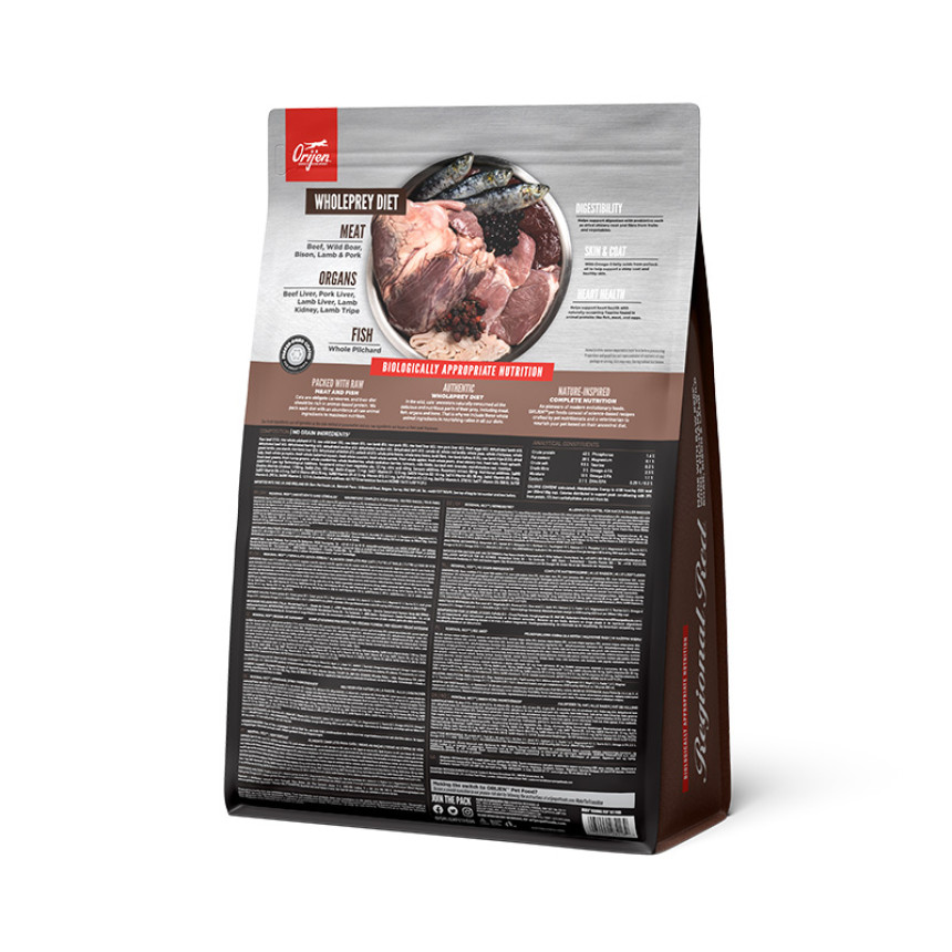 Раціон ОРІДЖЕН РЕГІОНАЛ РЕД КЕТ забезпечує вашого кота високопоживним протеїнами та нутрієнтами, яких вони потребують, зі свіжих або сирих інгредієнтів, таких як м’ясо бичків, дикого кабана, бізона, ягняти та поросят.