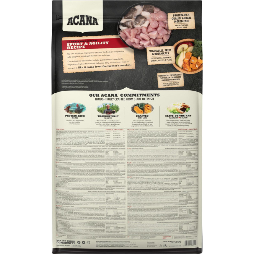 Коли це стосується корму ACANA, кожен інгредієнт має значення. Саме тому рецептура корму ACANA Sport & Agility Recipe створюється з турботою, щоб забезпечувати всі потреби дорослих активних собак у харчуванні. Рецептура АКАНА Спорт енд Аджиліті Ресіпе на 75 % переповнена якісними м'ясними інгредієнтами, такими як м'ясо канадських курчат та сирої камбали та на 25 % збалансована фруктами, овочами та травами.