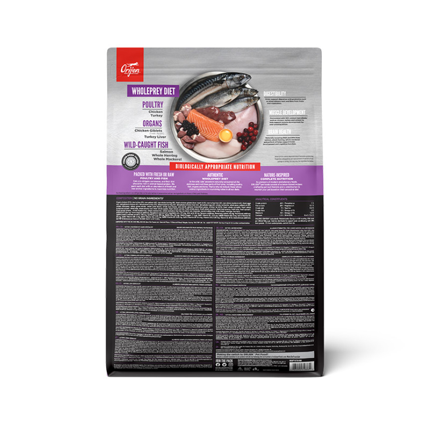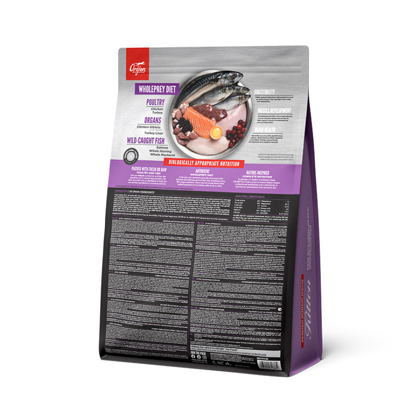 Раціон, на 90% сповнений преміальними м’ясними інгредієнтами, такими як курчата, індичка та лосось допомагають підтримувати розвиток мускулатури у зростаючих кошенят. Також, цей раціон містить 15 свіжих або сирих інгредієнтів, включаючи інгредієнти WholePrey, такі як м’язове м’ясо, високопоживні органи та їстівні кістки – найбільш поживні та соковиті частини здобичі. Раціон допомагає підтримувати розвиток мозку вашого кошеняти та когнітивну функцію за допомогою ДГК та ЕПК з лососю , цільної макрелі, оселедцю та жиру минтаю.